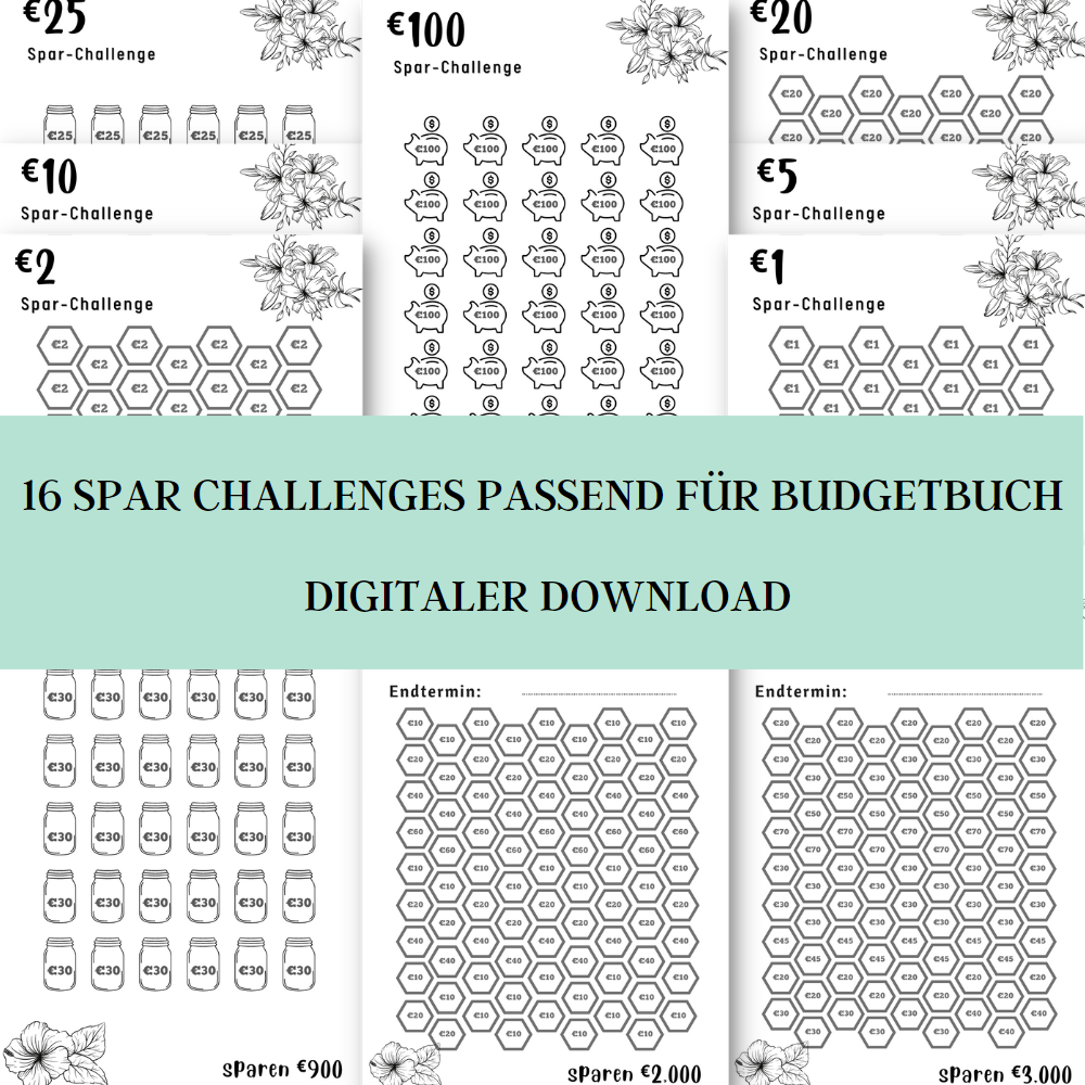 16 spar challenge deutsc | geld sparen challenge | Finanzplaner | Digitaler PDF Download | A6 | Budget Binder | Sparset, Finanzen, Challenge, Tracker.